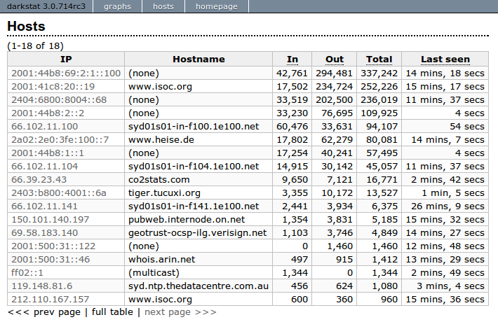DarkStat est un outil de monitoring réseau simple et léger. Il présente ses résultats via une interface web par des graphiques simplifiés avec leurs statistiques sommaires (min/moy/max) et d’un récapitulatif du trafic pour les différentes adresses IP ayant eu une connexion avec la machine surveillée. Il a une très faible utilisation mémoire et processeur et ne vient donc pas entamer les précieuses ressources de votre machine. 1)