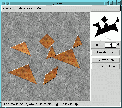 Le Tangram est un puzzle chinois où le joueur doit arranger un ensemble de pièces pour correspondre à une forme donnée. Toutes les pièces doivent être utilisée et ne doivent pas être mises l'une par dessus l'autre. Le jeu de pièces est constitué de 5 triangles, un carré et un parallélogramme. Le jeu gtans fournit 380 figures avec lesquelles jouer. La souris permet de contrôler les pièces. Le jeu est fortement configurable via son interface.