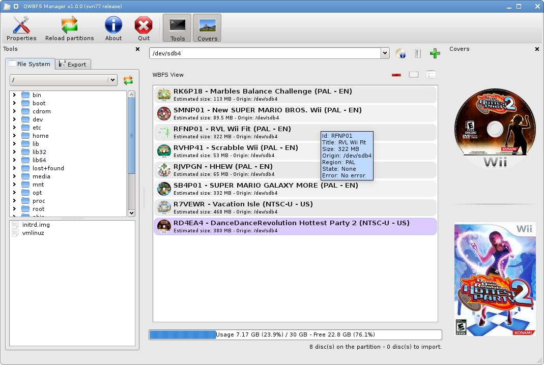 - Possibilité d'ouvrir plusieurs partitions wbfs au sein du logiciel (export/import par lot, wbfs à wbfs copie).