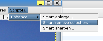Puis, sur le calque, faites un clic droit, suivi de Alpha vers sélection. Sélectionnez le calque avec votre photo, puis rendez vous dans le menu Script Fu → Enhance → Smart remove selection.