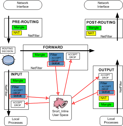 Il reçoit les paquets envoyés par le firewall Netfilter avec l'aide de la librairie libipq, les compare avec des règles de signature Snort et les marque en "drop" s'ils correspondent à une règle, puis finalement les renvoie vers Netfilter où les paquets Snort_Inline marqués sont rejetés.